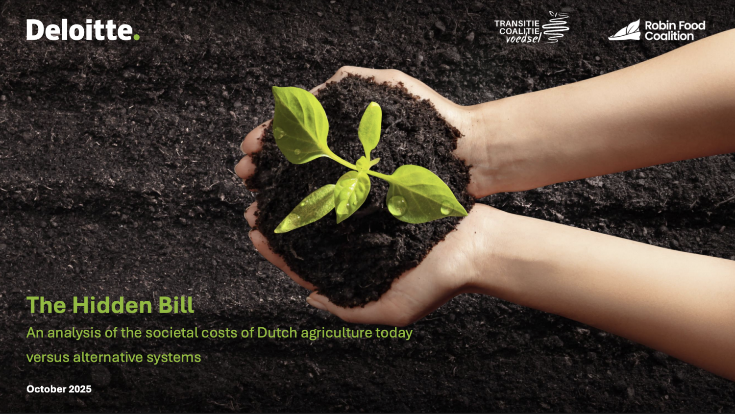 The Hidden Bill: Reshaping Dutch Agriculture is uitgevoerd door Deloitte in opdracht van de Robin Food Coalition en de Transitiecoalitie Voedsel. De analyse kwantificeert voor het eerst de maatschappelijke kosten van het Nederlandse landbouw- en voedselsysteem en vergelijkt deze met alternatieve varianten om de sector te verduurzamen. De berekeningen zijn gebaseerd op beschikbare data, aannames van erkende norm- en kennisbronnen en opinies van geïnterviewde experts.